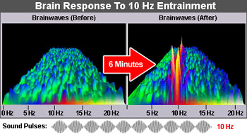 This new technology, is based on binaural beat frequencies and their effect on the sub cortical auditory system of the brain. After five minutes, the resonant entrainment effect has induced vast areas of the brain to resonate at the same frequency. The result is a dominant brain wave pattern at the desired frequency.